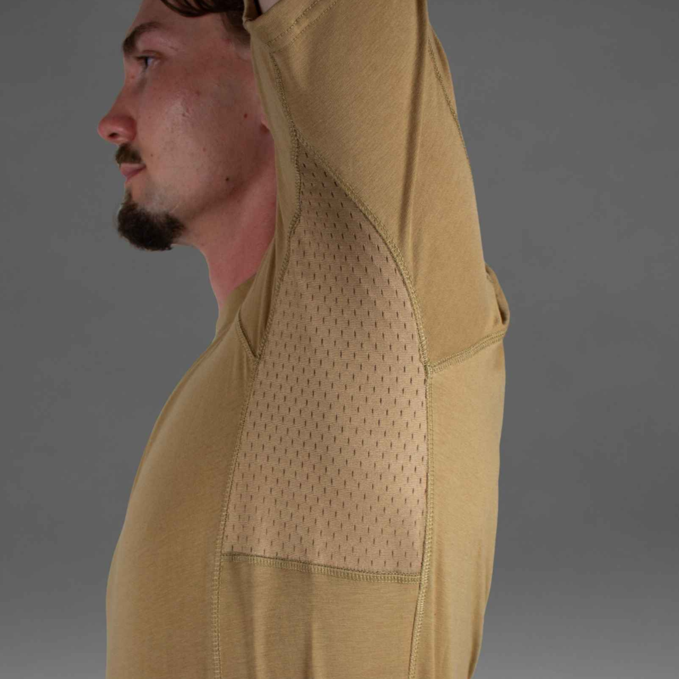 Die Kombination aus elastischem Material und Mesh sorgt für optimale Belüftung und Bewegungsfreiheit. Die Overlock-Nähte wurden so positioniert, dass sie nicht scheuern und auch unter Gear kaum spürbar sind – selbst bei langen Einsätzen oder starker körperlicher Belastung.